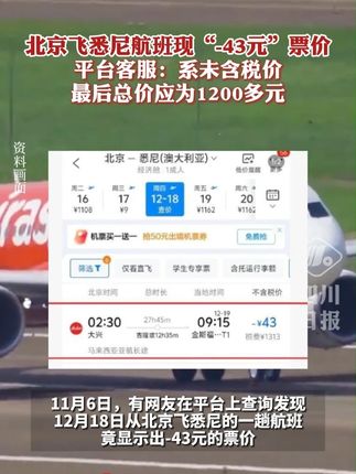 C视频丨北京飞悉尼航班现“-43元”票价,平台客服:系未含税价,最后总价应为1200多元