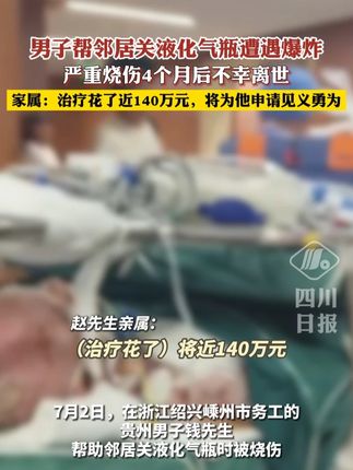 男子帮邻居关液化气瓶遭遇爆炸,严重烧伤4个月后不幸离世,家属称医疗费用花了近140万元,将申请见义勇为。【详细】