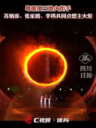 C视频丨2025全运会开幕式,粤港澳三地火炬手苏炳添、张家朗、李祎共同点燃主火炬