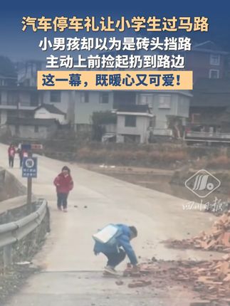 C视频丨暖心又可爱!汽车停车礼让小学生过马路,小男孩却以为是砖头挡路,主动上前捡起扔到路边