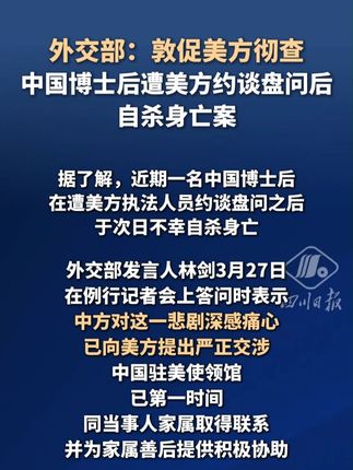 一名中国博士后在遭美方约谈盘问后自杀身亡,外交部:敦促美方彻查【详细】