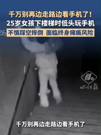 千万别再边走路边看手机了!25岁女孩下楼梯时低头玩手机,不慎踩空摔倒,面临终身瘫痪风险。【详细】