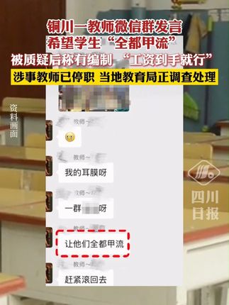 铜川一教师微信群发言希望学生“全都甲流”,目前涉事教师已停职,当地教育局正调查处理。【详细】