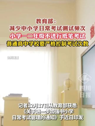 教育部:减少中小学日常考试测试频次,小学一二年级不进行纸笔考试。【详细】