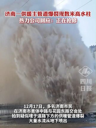 济南一供暖主管道爆裂现数米高水柱,热力公司回应:正在抢修。【详细】