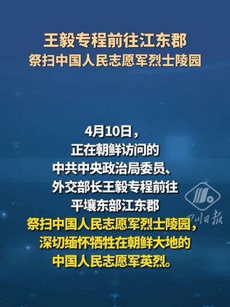 当地时间2026年4月10日,正在朝鲜访问的中共中央政治局委员、外交部长王毅专程前往平壤东部江东郡祭扫中国人民志愿军烈士陵园,深切缅怀牺牲在朝鲜大地的中国人民志愿军英烈。【详细】