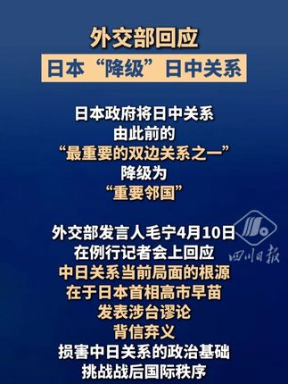 外交部回应日本“降级”日中关系:日方应以实际行动维护中日关系政治基础。【详细】