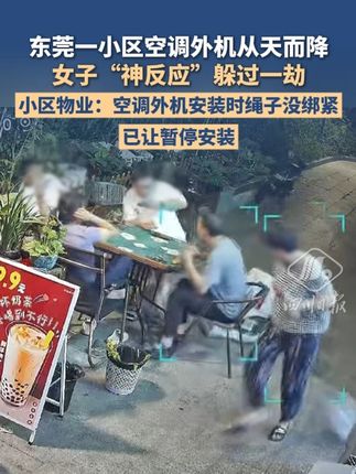 看得一身冷汗!东莞一小区空调外机从天而降,女子“神反应”躲过一劫。【详细】
