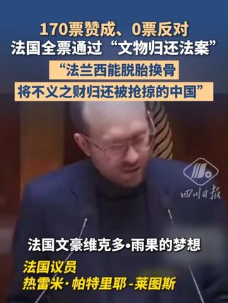 170票赞成、0票反对,法国全票通过“文物归还法案”:“法兰西能脱胎换骨,将不义之财归还被抢掠的中国”。【详细】