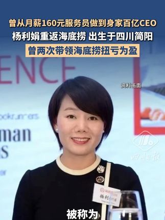 曾从月薪160元服务员做到身家百亿CEO,杨利娟重返海底捞,出生于四川简阳,两次带领海底捞扭亏为盈。【详细】
