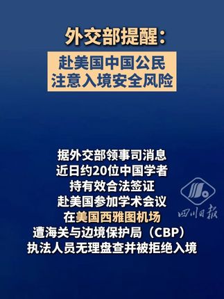 外交部提醒:约20位中国学者遭无理盘查并被拒绝入境,赴美国中国公民注意入境安全风险。【详细】