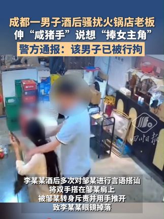 成都一男子酒后骚扰火锅店老板,伸“咸猪手”说想“捧女主角”,警方通报:该男子已被行拘。【详细】