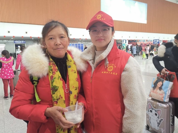 “一下车还有免费的汤圆吃,顿时感觉心里暖暖的。”在候车厅中的“农民工平安返乡服务岗”前,一碗热气腾腾的汤圆让来自资中县龙江镇的杨鑫苹倍感温暖。今年她带着姨妈回老家过年,看着出发时间还有1个小时,正在犹豫要不要吃点东西,但又怕耽误时间。“感谢工会为我们提供的贴心服务,喝上一口热汤,这下心里可舒坦了。”杨鑫苹感激地说。