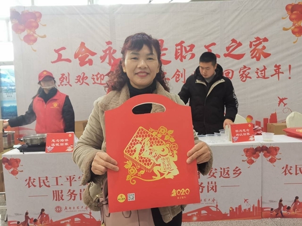 “真是太幸运了,去年返乡过年就享受到福利,领到了免费的牛奶和面包,今天又有汤圆送,年年都得到工会的关心。”来自内江威远县48岁的李雪梅带着爽朗的笑声说道。