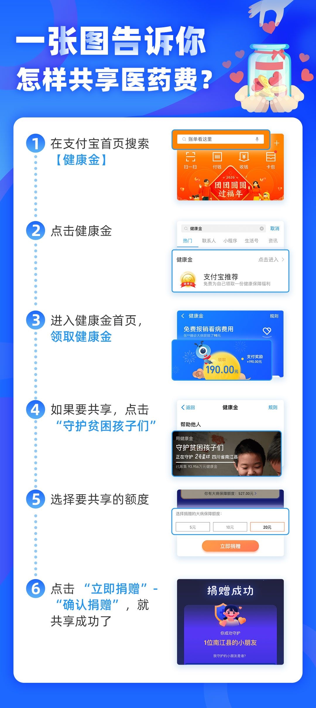 为了满足用户的心愿,支付宝新推出“共享医药费”公益服务。每期公益服务会和一个贫困地区合作,用户共享出健康金,支付宝则出资为当地贫困儿童购买同等额度的大病保险,如果孩子生病,可以一次性拿到2万元医药费。共享操作很简单,在健康金首页找到“帮助他人”栏目,点击进入后,按页面提示操作即可。