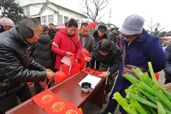 黄庙社区黄大爷手里拿着“福”字,眼里望着写春联的书法家,感慨地说:“这些老师送福到万家,我们想写什么就写什么,还不花一分钱,就可以迎福回家,很感谢老师们”。