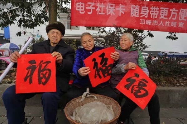 四川在线消息(记者 方炜 摄影 张超云)2020年1月22日,临济镇幸福广场热闹非凡,邛崃市书法家们现场书写500多个福字,拼成一个巨大的“福”字,将诚意满满的祝福送给临济镇父老乡亲,村民们欢天喜地接福回家。