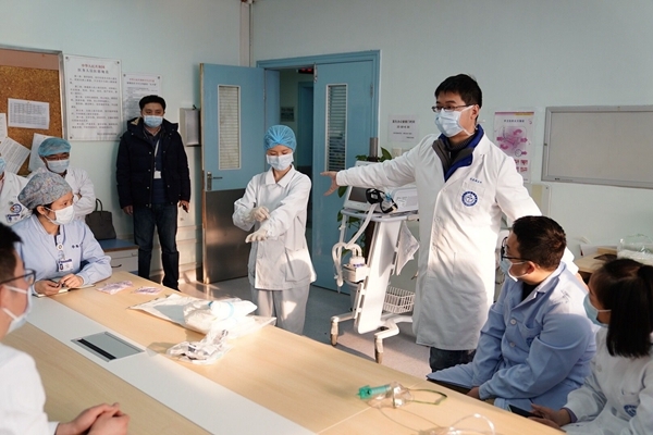 09:00: 第一住院大楼13楼呼吸综合病房内,呼吸与危重症医学科支部书记、副主任罗凤鸣正在组织他的队员开展新型冠状病毒诊疗及防护培训。