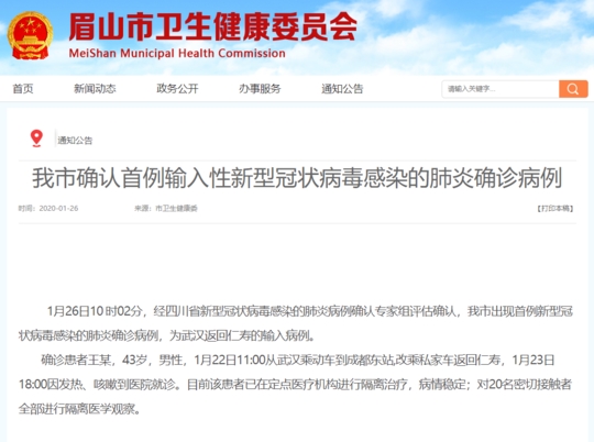 1月26日上午10点左右,眉山市卫健委发布消息称,1月26日10时02分,经四川省新型冠状病毒感染的肺炎病例确认专家组评估确认,眉山市出现首例新型冠状病毒感染的肺炎确诊病例,为武汉返回仁寿的输入病例。确诊患者王某,43岁,男性,1月22日11:00从武汉乘动车到成都东站,改乘私家车返回仁寿,1月23日18:00因发热、咳嗽到医院就诊。目前该患者已在定点医疗机构进行隔离治疗,病情稳定;对20名密切接触者全部进行隔离医学观察。