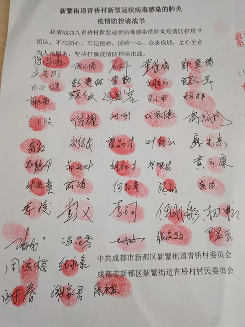 四川在线消息(记者 张红霞)1月30日,成都市新都区新繁街道青桥村开展了新型冠状病毒感染的肺炎疫情防控党员志愿者活动。党员及志愿者们签下疫情防控请战书,签上自己的名字并按下红手印。