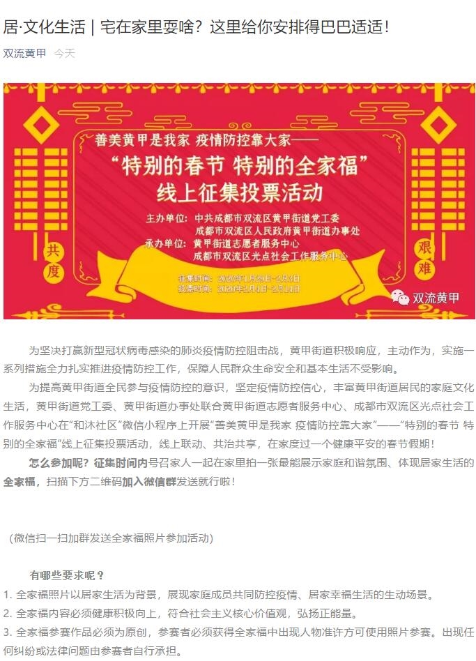 四川在线消息(记者 丁宁)1月30日,“宅家”的双流区黄甲街道居民有了事情做——拍一张展现疫情防控时期居家生活的“全家福”照片。据悉,这是黄甲街道党工委、黄甲街道办事处联合黄甲街道志愿者服务中心、成都市双流区光点社会工作服务中心在黄甲街道“和沐社区”线上信息支持平台开展“善美黄甲是我家 疫情防控靠大家”——“特别的春节 特别的全家福”线上征集投票活动,线上联动、共治共享,在家度过一个健康平安的春节假期。