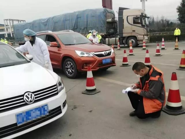 志愿者们放弃与家人团聚的时间,来到成名高速名山服务区与相关部门、警察和医务工作者们一起执勤,为过往车辆司机乘客做登记,测体温。
