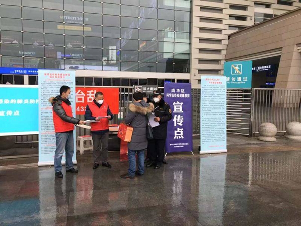 针对成都东客站面积大,过往旅客多,防控任务重的实际,成华区充分发动属地政府、机关干部、党员义工参与群防群控,驻点协助进、出站旅客体温检测、宣传引导等工作,与成都东站和长途客运站形成合力。在人员密集区域设置“党员服务站、党员示范岗”,组织百名“党员政策宣讲员、党员纠纷调解员、党员信息联络员”活跃在各个宣传点、服务站。指挥区总工会、团区委、妇联、红十字会等系统、行业领域力量,开展“返家亲”“健康志愿行”“清洁家园”宣教关爱行动。
