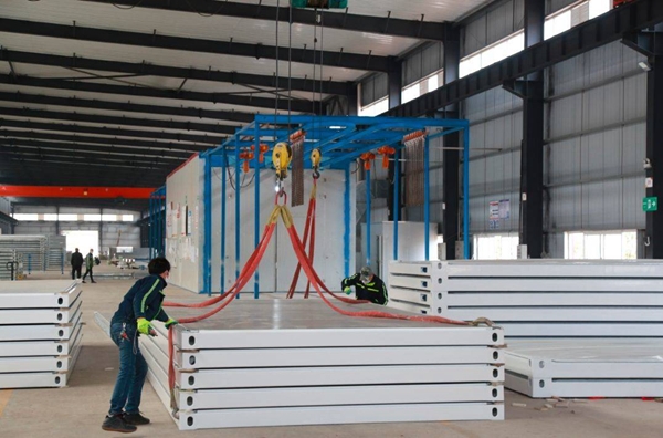 1月30日,早上8点,宋军到达模块组装工作岗位,开始一天的工作。他正将一块块用于搭建箱式房屋的模具从机器上抬下来,“麻利点,兄弟。早弄好,早拉到武汉。”宋军对工友说。