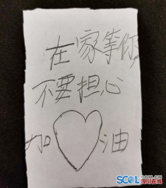 照片背面,小潇之用铅笔写上了“在家等你,不要担心、加油”的字样,并画上了一颗爱心。