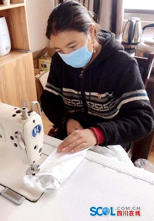 四川在线消息(朱晓智 记者 徐登林 文/图)比照着长宽,剪双层纱布毛巾、医用纱布、保鲜膜,把纱布毛巾叠双,保鲜膜和医用纱布夹在中间,再经缝合、穿上布带。2月3日,在阿坝州红原县邛溪镇三区合辙藏服有限公司,伴随脚踏缝纫机的响声,一个又一个口罩“新鲜出炉”。