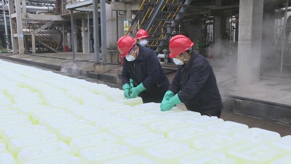 四川在线消息(曹洋)测量体温、消毒、登记……2月3日,经过一系列准备工作后,位于宜宾市江安县的天原集团海丰和锐有限公司次氯酸钠生产现场,50余名员工开始了一天的工作。