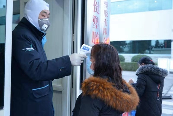 崇州君健塑胶有限公司安保人员介绍说,“我们对返厂员工进行人员摸排、信息登记、履历询问、人员消毒等相关措施,并对厂区实施封闭式的管理。”
