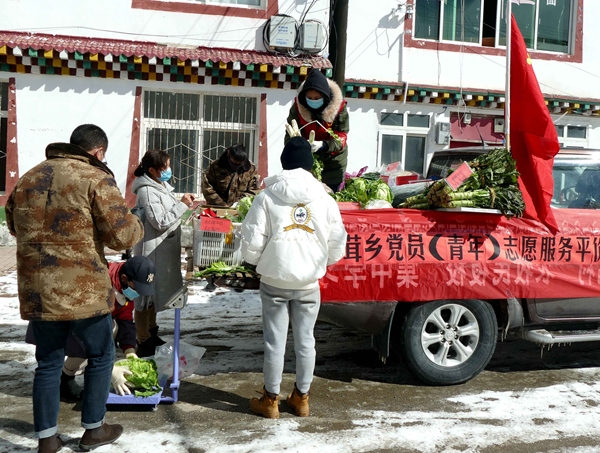 面对新型冠状病毒感染的肺炎疫情,为确保牧民群众的生活需要,红原县江茸乡组织10名党员、团员(青年)成立疫情防控临时志愿服务队,义务为辖区牧民群众人员提供送菜上门服务。
