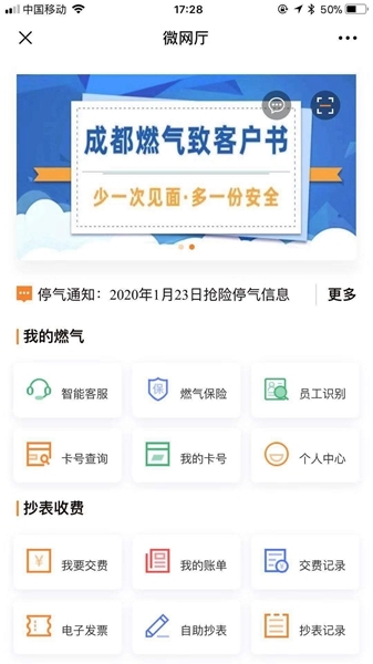 为全力保障居民“宅家”生活不愁,疫情防控期间,成都燃气呼吁“少一次见面,多一份安全”,调整客户服务工作方式,推行“空中服务”,客户足不出户即可通过“成都燃气962777”微信公众号办理燃气查询、交费、开票、更名、过户等服务;采用电话、微信或短信的方式抄收气量,支持微网厅、微信、支付宝等方式交纳气费,客户有燃气欠费的,也不作停气处理。同时,该公司指派专人,做好服务大厅、服务中心等场所日常消毒工作,创造符合防范要求的服务环境。目前,成都燃气3座储气站、6座配气站、7座门站、1万余座调压站均正常运行,300余万客户用气无忧。