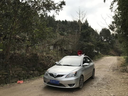 街当头的村委会门口,村主任邓泽凡正发动车子准备巡村,车顶上,两根白绸带帮着一个红色喇叭,邓泽凡掏出手机一点,喇叭随即开始播送防疫宣传语。"村里一共13个社,来回接近30公里,跑一趟回来正好吃午饭。"