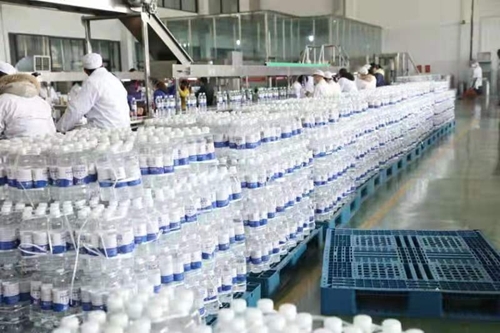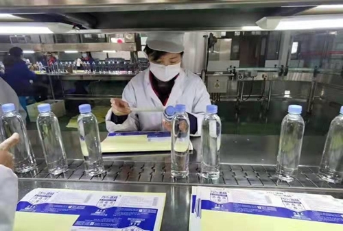 2月5号,两条用于分装75%酒精的分装线已全部开启,工人们师傅们正在加紧分装。据介绍,两条生产线已全部正常运转,每天24小时生产分装,产量大约在15万瓶左右。