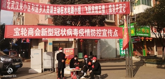 赵洪艳时刻关注当地官网发出的公告,每出一个官方公告,赵洪艳就转到商会群里。据不完全统计,在宝轮商会党支部号召引领下,全镇12家娱乐场所,10多家网吧、KTV、大小茶楼、酒吧在公告发出之日迅速停业,各类酒店宴席上千桌延期和退订。除此之外,辖区主要商业区、沿街商贸等40余处商家、商铺主动提供音响视屏器材,帮助宣传疫情防控知识,营造防疫氛围。