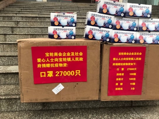 截至发稿,宝轮商会联合支部共募集现金捐款35万余元,筹集的善款下单的2.7万只口罩到货1.3万只、酒精等消毒用品300余件、弥雾消杀机3台、红外电子温度计20个、移动音响4台以及价值15000元的防疫宣传产品,全部定向捐赠给宝轮镇党委政府。