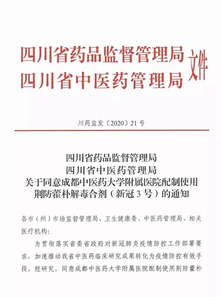 四川在线消息(记者 杨丹)2月12日,四川省药品监督管理局、四川省中医药管理局联合印发通知,疫情期间,同意西南医科大学附属中医医院申报的“清肺排毒合剂(新冠1号)”和成都中医药大学附属医院(四川省中医院)申报的“银翘藿朴退热合剂(新冠2号)”、“荆防解毒合剂(新冠3号)”,在全省205家新型冠状病毒感染的肺炎定点救治医院直接调剂使用,无需向省药品监督管理局提出调剂申请;非四川省定点医院申请调剂使用的,省药品监督管理局予以快速审批。四川省中医管理局特别提醒广大市民:新冠1、2、3号是治疗处方,非预防处方,“治疗的药,没病不能瞎吃哦。”