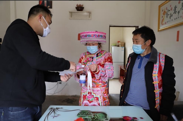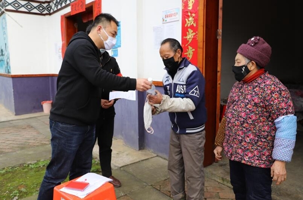 四川在线消息(梁俊 记者 颜婧)1月13日,在宜宾市兴文县古宋镇星火社区村的免费酒精发放处,苗汉同胞们陆续前来领取消毒酒精、使用温馨提示、自制口罩。针对行动不便、空巢老人等特殊群众,村组干部、志愿者把消毒酒精送上门。
