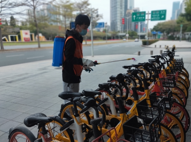 记者了解到,在建议用户骑行前对车辆关键部位进行擦拭的同时,单车企业也在积极主动做好线下单车消毒工作,由一线运维人员随身消毒喷雾器、消毒水等消毒用品,对负责区域内所有共享单车进行“无差别消毒”。对轨道交通沿线、商圈、交通枢纽等重点区域,结合单车清理、摆放等环节做好集中消毒;对路面共享单车的车把手、坐垫、车架等与市民接触部位进行重点喷洒消毒;对仓库中的单车,亦进行全方位清洁、消毒。