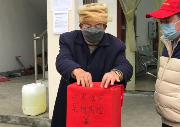 最近几天,天泉社区居委会渐渐变得“热闹”起来,附近村民陆续来到居委会,“2000元、1000元、500元”、“口罩100个、消毒水五瓶、方便面4件”,村民有防护物资的捐物资,没有物资的直接捐现金。