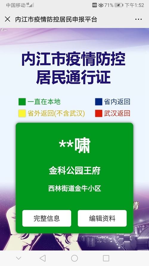 按照一直在本地、省内返回、省外返回(不含武汉)、武汉返回等4个类别,内江市疫情防控居民通行证分为绿色、蓝色、黄色、红色四种。内江市民出入小区时,只需要扫描二维码,小区工作人员便可以看到相关信息,一目了然。