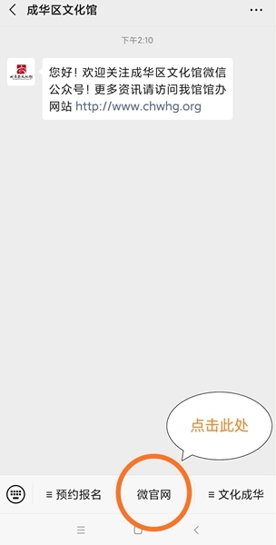 1、搜索成华区文化馆微信公众号,点击关注,进入一下页面。