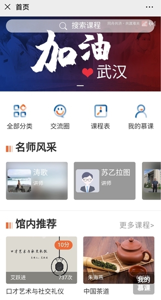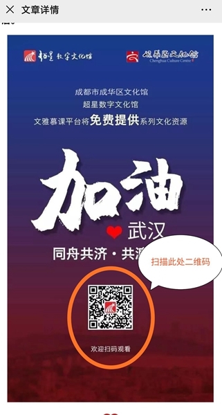 “文化馆从大年三十起暂行闭馆,暂停线下各项群众文化活动,但为大家提供公共文化服务的职责和使命不会停,让广大市民朋友足不出户也能获取海量文化资源,丰富居民文化生活。”据成华区文化馆相关负责人表示,疫情防控期间,文化馆联合“超星数字文化馆”共同推出了一系列免费的线上课程,涉及历史、文学、艺术、国学、科学、哲学、心理学、影视、音乐、非遗、生活百科等等,内容丰富、获取方便。“在这个特殊时期里,文化馆将陆续为大家送上系列线上活动,满足大家的文化需求,丰富精神生活。”