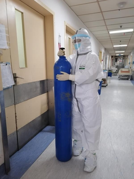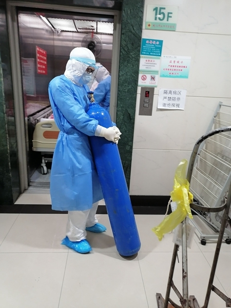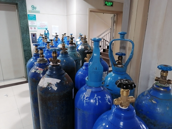 由于武汉市红十字会医院先前只是一家综合性的二级医院,只能满足100多个病人的吸氧量。疫情爆发后,医院被定为首批发热患者定点诊疗医院,就诊患者骤增,单日最高门诊量达2400人次,医院各病区改造成发热病区收治新冠肺炎危重患者,原有的供氧系统无法满足新冠肺炎患者治疗需求。氧压低的那段时间,基本靠护理人员从各个楼层、病区搬运氧气瓶,据悉,一个氧气瓶装满后有200斤左右。