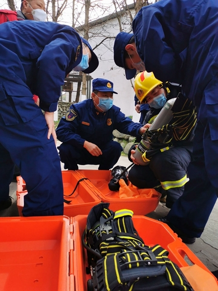 对复工复产企业的消防检查更多地体现出技术指导和服务的特点。在久业化工,检查人员查看消防装备正压式空气呼吸器瓶时,拧开旋钮查看气瓶贮气量。“气瓶如果气不够了,马上告知我们,消防大队免费为你们充。”检查人员反复叮嘱企业负责人。在现场,检查人员请员工进行消防防护佩戴操作,不规范的地方,马上进行技术指导和纠正……