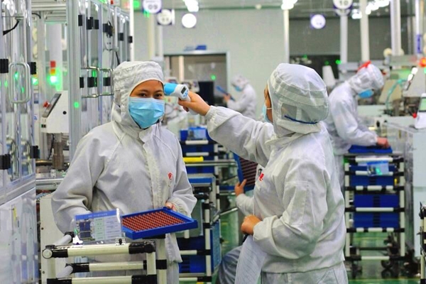 四川在线消息(肖开丰 顾朝辉 记者 余如波)2月18日10时,位于德阳市中江县的四川宏发电声有限公司内,绕线车间班班长谢晓丽一手拿体温检测仪,一手拿管理台账,按时对班组19人进行体温检测。