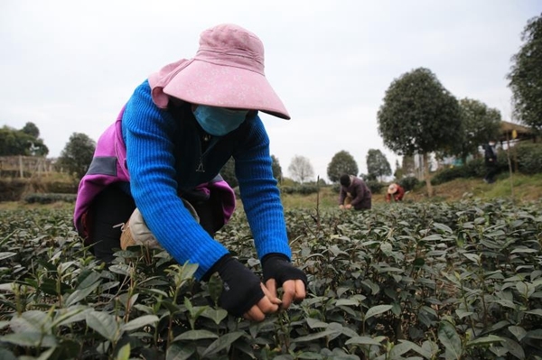 四川在线消息(记者方炜)连日来,随着春日的回归,天气放晴,气温回升,茶树萌发新芽。2月18日一大早,邛崃市卧龙街道杯土村文君茶业公园的茶园就热闹起来。趁着天气晴好,香力源茶业合作社负责人陈鹏飞带着采茶工人们开始了今年的第一批春茶采摘。虽然经过了前期的人员筛查、健康体检,陈鹏飞还是在旁边时不时提醒采茶工人尽量错开,每个人间隔2米以上,采茶叶的时候不要掐,要注意质量。