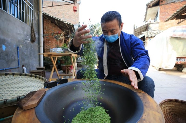 在春茶大面积开采的同时,不少茶业加工作坊、茶业企业也迅速复工复产,开足马力,满负荷投入生产。在邛崃市夹关镇,茶业加工老板李军也趁着天气晴好,开始了手工制茶。
